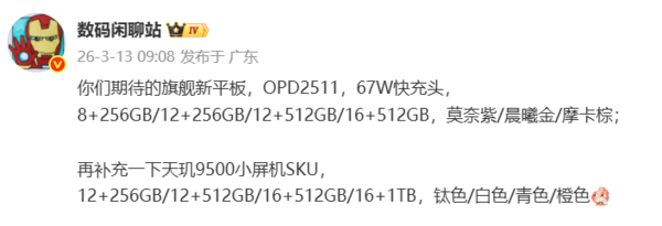 【CNMO科技消息】3月13日,博主“数码闲聊站”疑似曝光了OPPO两款新品的备案信息。据博主透露,OPPO即将推出的旗舰级平板型号为OPD2511(或命名为OPPO Pad mini)。其核心存储版本将提供四种选择:8GB+256GB、12GB+256GB、12GB+512GB和16GB+512GB。配色方面,这款平板预计将带来莫奈紫、晨曦金、摩卡棕三款时尚配色。充电规格上,它有望配备67W快充头。同时曝光的还有搭载天玑9500处理器的小屏旗舰的SKU信息,该机预计将提供四档存储组合:12GB+256GB、12GB+512GB、16GB+512GB和16GB+1TB现在还有实盘配资吗,配色方面,新机可能将推出钛色、白色、青色、橙色四款选择。