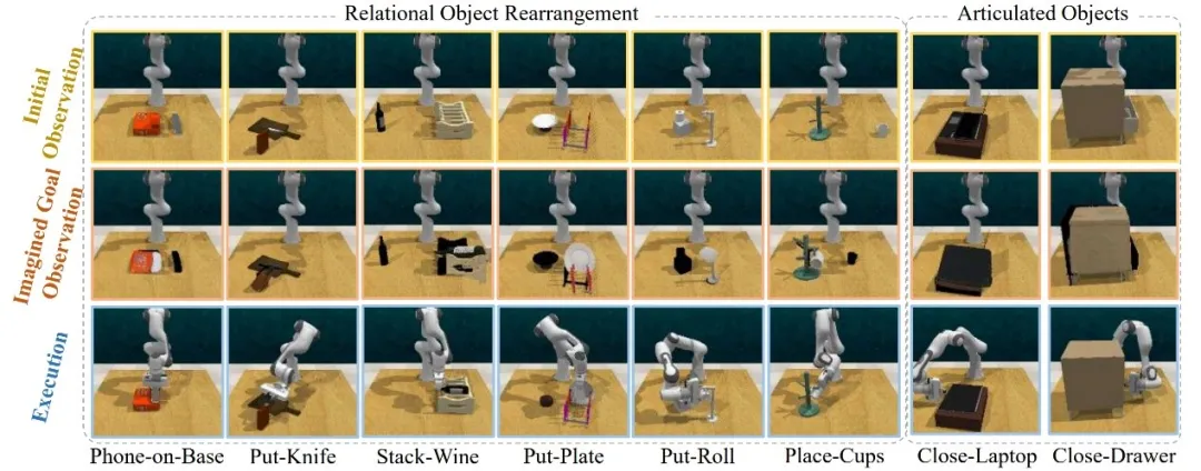 然后,通过一套“物体-动作一致性学习”机制,确保机器人的实际操作动作与这个“想象目标”紧密对齐,从而在利用先验知识的同时,避免了直接执行生成目标可能带来的误差。实验表明,该框架在插花、叠杯等7项仿真任务中平均成功率达到79%,在6项真实世界任务中达到68%,显著优于主流方法。