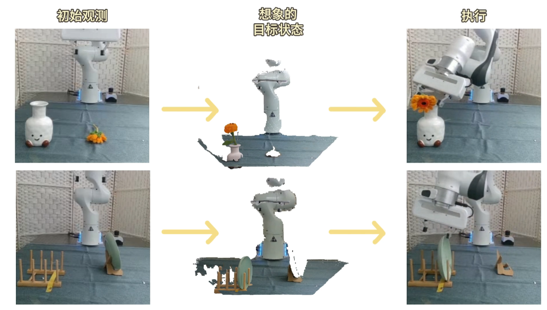 具体而言,系统会首先生成一个与真实场景精确对齐的“想象目标”点云(例如,花在花瓶中的正确姿态),为机器人提供清晰的几何先验。