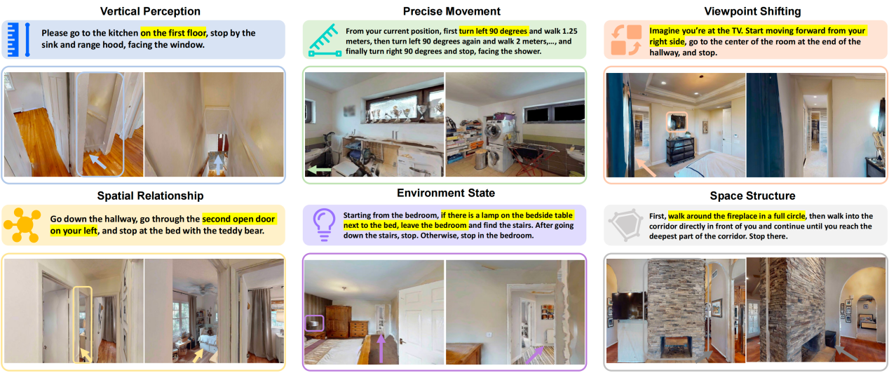 NavSpace设计了超过1200条涵盖方位、距离、地标、空间关系、环境状态、空间结构等六大类的动态指令,要求机器人不是简单地走到某个点,而是在移动中持续进行空间推理。