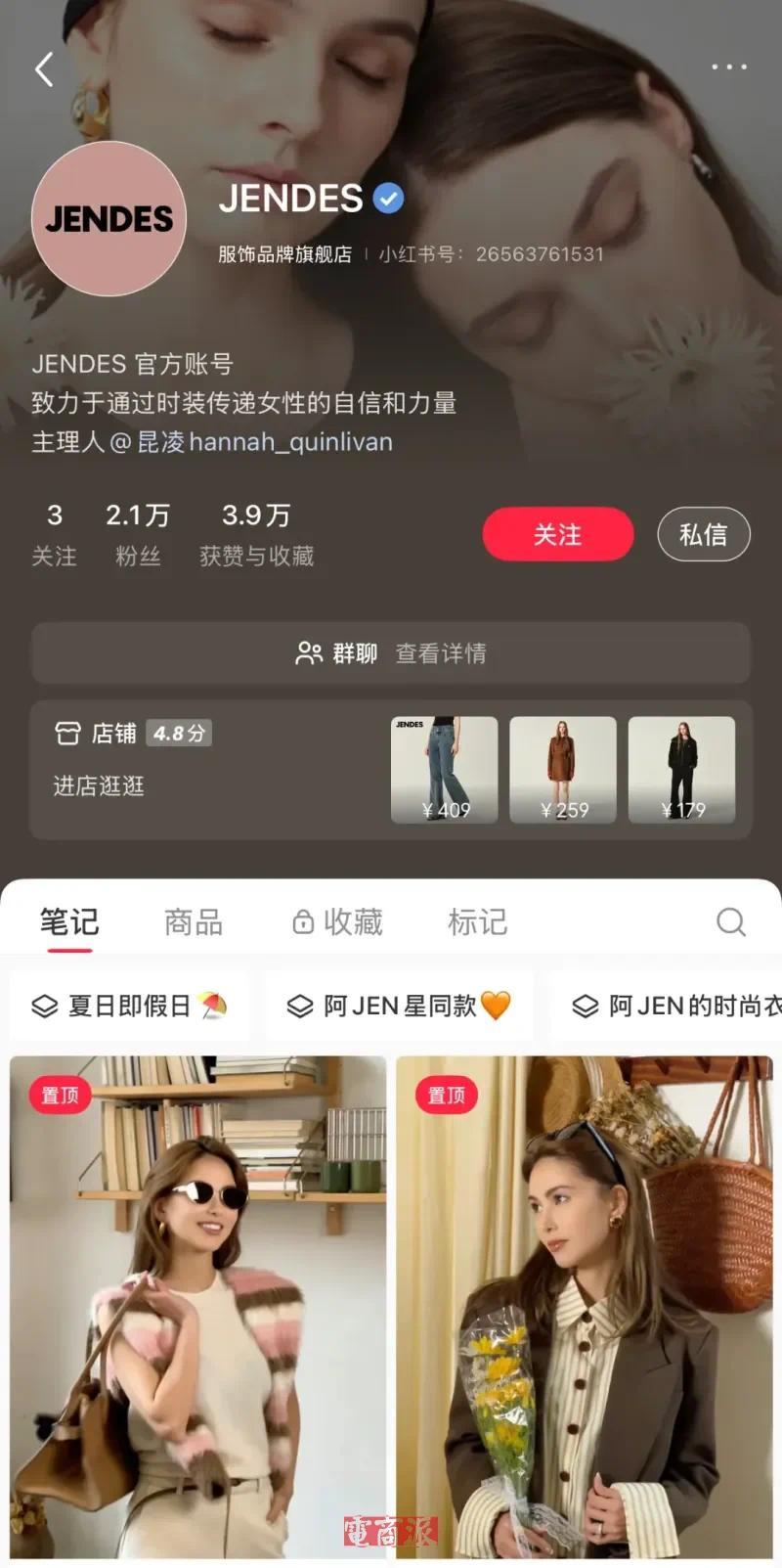 另外,昆凌也早已创立了个人服装品牌JENDES,定位“致力于通过时装传递女性的自信和力量”。在小红书上,该品牌也开设了账号,拥有2.1万粉丝,属于小众精品品牌。