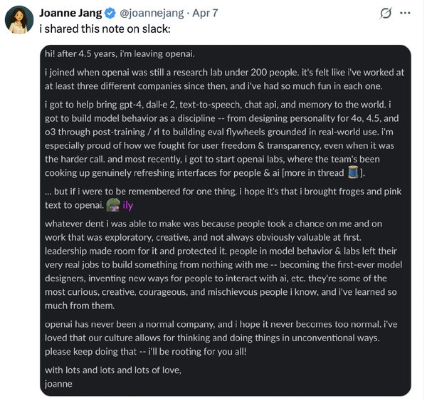 【CNMO科技消息】当地时间4月7日,距离OpenAI宣布完成1220亿美元史上最大规模AI融资仅仅过去一周,被誉为“GPT-4o之母”的Joanne Jang在社交平台X上发布离职声明,结束了四年半的OpenAI职业生涯。